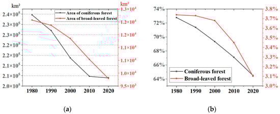 Changes in coniferous and broadleaf forests: (a) area change; (b) change in coverage.
