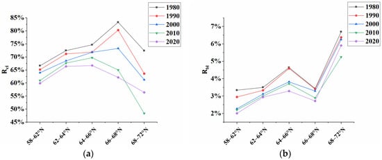 Spatially, Rcl is basically decreasing in all latitudinal zones. Rbl is decreasing in the 58° N–68° N and increasing in the 68° N–72° N region. In 1980, Rcl was the highest in the 66° N–68° N region, and Rbl was the highest in the 68° N–72° N region. In 2000, Rcl was the highest in the 66° N–68° N region, and Rbl was the highest in the 68° N–72° N region. In 2020, Rcl was the highest at 64° N–66° N and Rbl was the highest at 68° N–72° N.