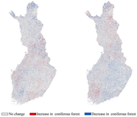 The boreal forests of Siberia tend to increase in varying degrees from the temperate to the boreal zone []. In the same geographical location, forest growing conditions are deteriorating in southern Finland, and forests in the north have only begun to increase in the last decade. Studies show that Finland’s forests are suffering from climate change and bioerosion risks [,,,]. In comparison to the boreal forest fires in Siberia and Canada, the Nordic forests seem much gentler []. Boreal forests in different regions do not reflect a very high degree of uniformity, but they share the common feature of expanding into the Arctic Ocean. The jury is also still out on the merits of this phenomenon []. The study demonstrated the significant impact of climate change on forest cover, as well as the impact of other factors on forest cover. In southern Finland, the interconversion of forests and arable land is the most pronounced. Land development also influences changes in forest cover. The forests of southern Finland are affected by climatic and anthropogenic factors, as well as other factors, and the situation is not optimistic.
