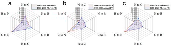 In order to further investigate the changes in forest types, the interconversion between coniferous forest (C), broadleaf forest (B), and unforested land (N) was counted using image element superposition and raster computation methods. The data were categorized into three phases, 1980–2000, 2000–2020, and 1980–2020, for the convenience of information statistics. Figure 9 shows the transformation of coniferous forests in two periods.