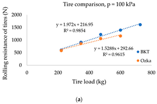 Figure 6a). It is clear from the graph that the cross ply tire had a slightly higher rolling resistance than the radial ply tire. In this context, it should be noted that despite the fact that tire manufacturers in their technical materials allow the operation of tires at pressures lower than 100 kPa (