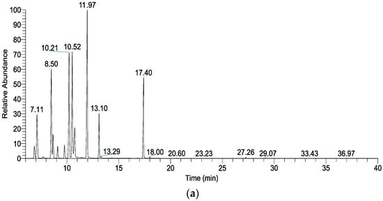 Gas chromatograms of the VOCs from L. formosana leaf essential oils at different temperatures: (a) 25 °C; (b) 50 °C.