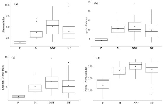 Characteristics of α-diversity indices in different forest stands. (a) Simpson index; (b) species richness; (c) Shannon–Winner index; (d) Pielou evenness index. Note: P represents pure Pinus tabulaeformis forests, M represents mixed forests, NNF represents near-natural forests, and NF represents natural forests.