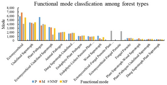 Changes in the abundance of functional mode of soil fungi during near-naturalization. Notes: P, Pinus tabulaeformis forest stage; M, mixed forest stage; NNF, near-natural forest stage; NF, natural secondary forest.