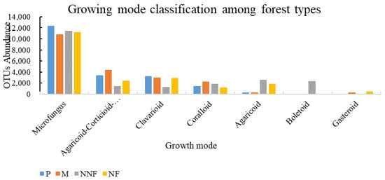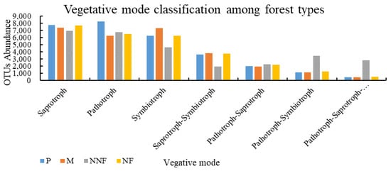 The results showed that the abundance of ectomycorrhizal fungi, saprophytic fungi, and plant pathogens dominated in the functional mode groups. The abundance of plant pathogens in the P. tabulaeformis forest stage was significantly higher than in other stages, and the abundance of ectomycorrhizal fungi in the near-natural forest stage was significantly lower than in other stages (Figure 2). The abundance of saprophytic, pathophysiological, and symbiotic nutrition dominated in the vegetative mode group. The abundance of pathotrophic fungi in the P. tabulaeformis forest stage was significantly higher than that in other stages, which was consistent with the highest abundance in functional mode. The abundance of symbiotroph in the near-natural forest stage was significantly lower than in other stages, which was also consistent with the ectomycorrhizal fungi in the functional mode group (Figure 3). The abundance of microfungi accounted for 53.06% of the growth mode group, which was the dominant group. The abundance of clavarioid decreased with the naturalization process (Figure 4).