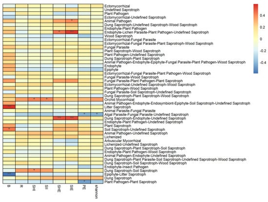 Correlation between tree layer diversity index and the abundance of soil fungi functional mode groups. B, biomass; R, richness index; SHI, Shannon−Wiener index; SII, Simpson index; SHE, Shannon−Wiener evenness index; SIE, Simpson evenness index; PE, Pielou evenness index. * means the significance level p < 0.05, ** means the significance level p < 0.01.