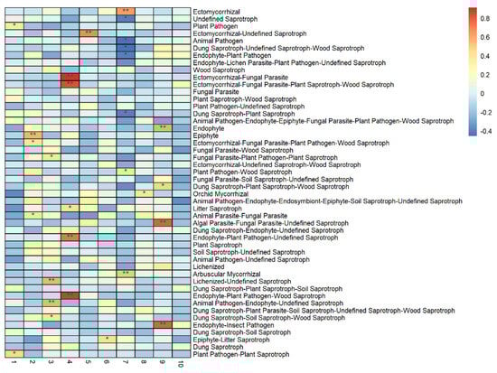Correlation between species composition in the tree layer and the abundance of soil fungi functional mode groups. 1. Pinus tabulaeformis; 2. Quercus variabilis; 3. Juglans mandshuruca; 4. Quercus mongolica; 5. Tilia amurensis; 6. Fraxinus chinensis; 7. Carpinus turczaninowii; 8. Quercus aliena; 9. Quercus dentata; 10 Tetradium daniellii. * means the significance level p < 0.05, ** means the significance level p < 0.01.