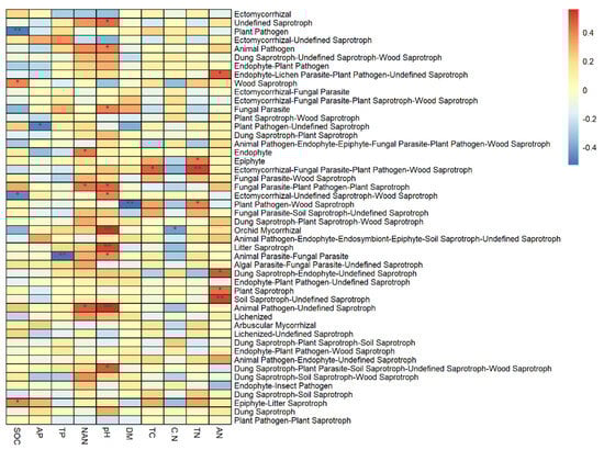 Correlation between soil properties and the abundance of fungal functional mode groups in soil. SOC, soil organic carbon; AP, available phosphorus; TP, total phosphorus; NAN, nitrate nitrogen; DM, dry matter content; TC, total carbon; C.N, carbon–nitrogen ratio; TN, total nitrogen; AN, ammonia nitrogen. * means the significance level p < 0.05, ** means the significance level p < 0.01.