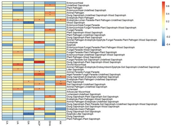 Correlation between soil enzyme activity and the abundance of soil fungi functional mode groups. CA, cellulase; UA, urease; GA, β-glucosidase; ACP, acid phosphatase; DHA, dehydrogenase. * means the significance level p < 0.05, ** means the significance level p < 0.01.