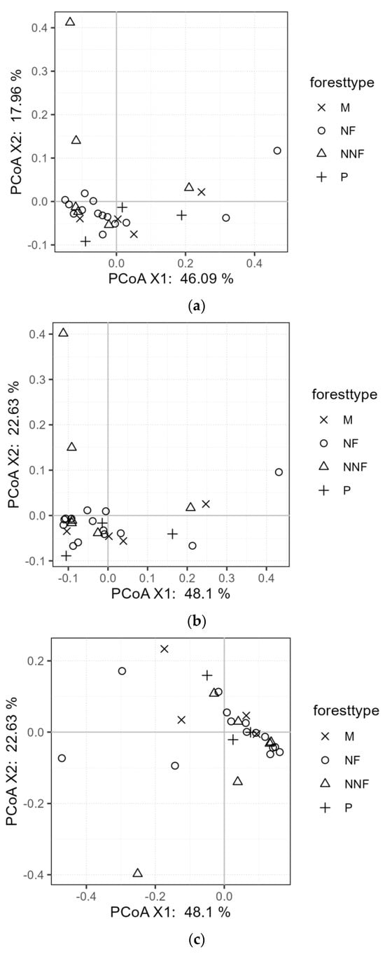 - Li, X.-L.; Qu, Z.-L.; Zhang, Y.-M.; Ge, Y.; Sun, H. Soil fungal community and potential function in different forest ecosystems. Diversity 2022, 14, 520. [Google Scholar] [CrossRef]