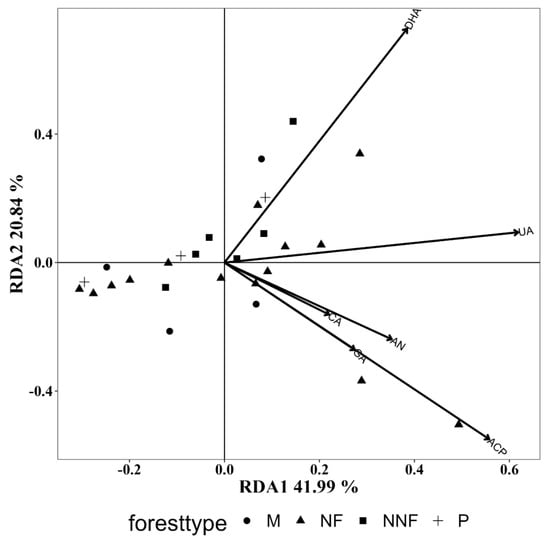 The Monte Carlo results of the RDA analysis showed that soil enzyme activities had significant effects on both the functional mode and growth mode, among which the activities of UA, ACP, and DHA significantly affected the former, and the activities of UA and GA significantly affected the latter (Table 7). The RDA analysis showed that the structural variation of functional mode was consistent with change in ACP activity during the progression from the P. tabulaeformis forest stage to the mixed forest stage. The community structure of the functional mode in the near-natural forest stage and the natural secondary forests was convergent on the RDA2 axis and was not significantly affected by soil enzyme activity (Figure 13). The structure of the soil fungal vegetative mode in the P. tabulaeformis forest stage and mixed forest stage was not significantly affected by soil enzyme activity but clearly changed in the near-natural forest stage, which was consistent with the change in soil GA activity (Figure S15). The community structure of the growth mode of soil fungi showed a tendency to converge gradually under the influence of enzyme activity during near-naturalization (Figure S16).