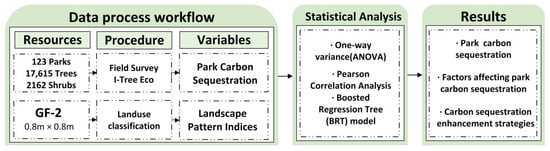 The study’s workflow is illustrated in Figure 1. The research was conducted in three main phases: (1) Vegetation carbon sequestration estimation: Field survey data and the i-Tree Eco model were used to quantify the carbon sequestration capacity of urban parks, while GF-2 remote sensing imagery was utilized to extract land use information and characterize park spatial structure. (2) Relationship analysis: Correlation analysis and Boosted Regression Trees (BRTs) were applied to examine the relationship between carbon sequestration capacity and landscape structure. (3) Spatial optimization strategy: Based on the findings, a spatial enhancement strategy was proposed to optimize park design for improved carbon sequestration.