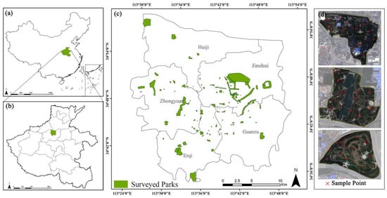 Location of the study area and vegetation sample plots in Zhengzhou, China. (a): Location of Henan Province in China; (b): location of Zhengzhou Central City within Henan Province; (c): distribution of 123 surveyed urban parks (in green) across five central districts of Zhengzhou; (d) aerial imagery of selected example parks showing sample plots marked with red crosses (×).