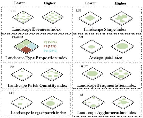 Building on previous studies of landscape pattern indices in Zhengzhou City, this study selected 11 key landscape indices to quantify the spatial characteristics of park green spaces [,]. These indices include perimeter–area ratio (PERIM), Shannon’s evenness index (SHEI), percentage of green space in the landscape (Pg), percentage of impervious surface in the landscape (Pi), percentage of water bodies in the landscape (Pw), number of green space patches (NP), largest patch index (LPI), landscape shape index (LSI), mean patch area (AREA_MN), patch cohesion index (SPLIT), and aggregation index (AI). The meaning and graphical representation of each landscape index are shown in Table 5 and Figure 3. The calculation of landscape pattern indices was implemented using Fragstats 4.2 software https://www.fragstats.org (accessed on 8 January 2023).