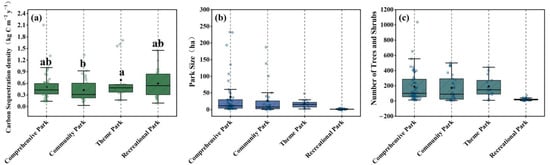 Box plots illustrate the variation in (a) vegetation carbon sequestration density, (b) park size, and (c) the number of trees and shrubs among different types of parks in Zhengzhou. Letters “a”, “b”, and “ab” above the boxes indicate groups that are significantly different according to Fisher’s Least Significant Difference (LSD) test (p < 0.05). Park types sharing at least one letter are not significantly different from each other.