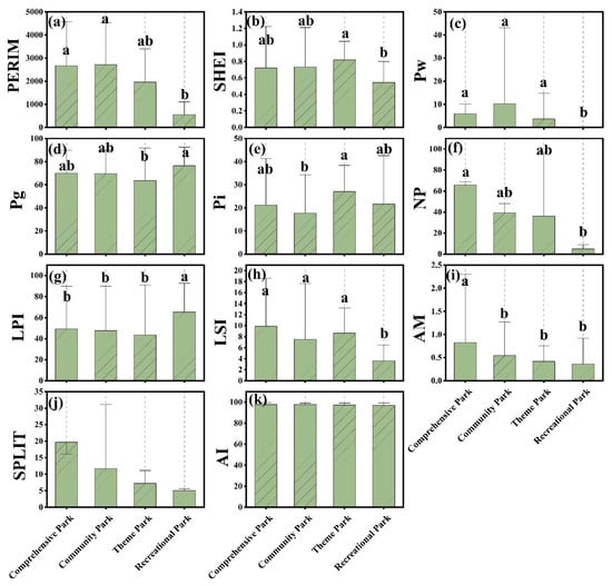 Differences in landscape pattern indices among four types of urban parks in Zhengzhou (a–k). Letters “a”, “b”, and “ab” indicate statistically significant groupings based on Fisher’s Least Significant Difference (LSD) test (p < 0.05). Bars that share a letter are not significantly different.