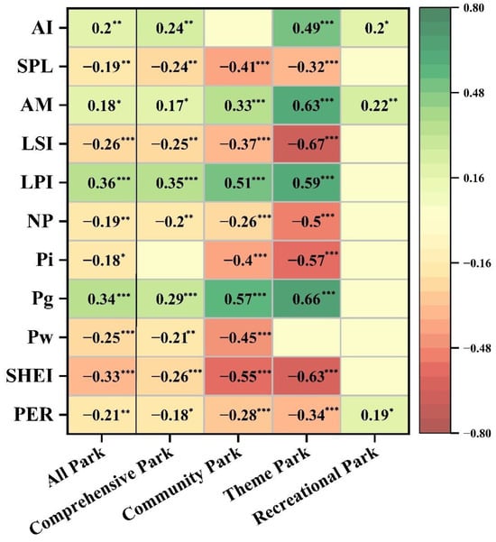Heatmaps illustrating the correlation coefficients between landscape pattern indices and vegetation carbon sequestration density (VCSD) across different park types. Asterisks indicate levels of statistical significance: p < 0.05 (*), p < 0.01 (**), and p < 0.001 (***). Cells without numbers indicate non-significant correlations (p ≥ 0.05).