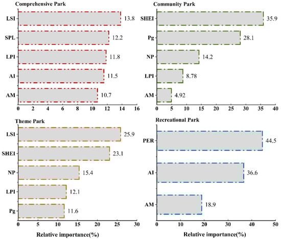 Based on the results of the correlation analysis, the relative importance of each influencing factor was quantified, and the top five indicators were visualized (Figure 7). The most important indicators for VCSD varied among park types, but overall, LSI, SHEI, LPI, NP, and Pg were found to be significant. In comprehensive parks, the top five indicators accounted for 60.2% of the total importance: LSI (13.8%), SPL (12.2%), LPI (11.8%), AI (11.5%), and AM (10.7%). For community parks, the five most influential landscape pattern indices were SHEI (35.9%), Pg (28.1%), NP (14.2%), LPI (8.78%), and AM (1.92%), totaling 91.9% of the total importance. Theme parks’ top five influencing factors accounted for 88.17% of the total importance, including LSI (25.9%), SHEI (23.1%), NP (15.4%), LPI (12.1%), and Pg (11.6%). The most important indicators for recreational parks were PER (44.5%), AI (36.6%), and AM (18.9%), accounting for 100% of the total importance.