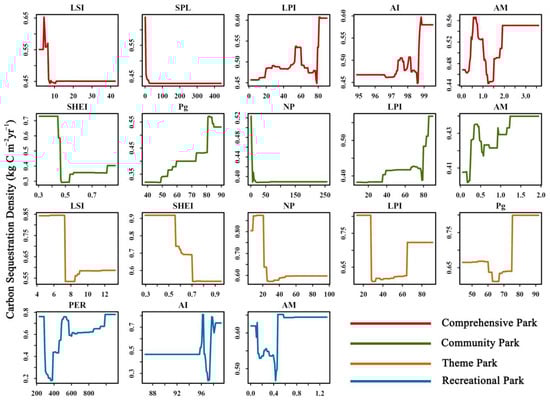 For community parks, VCSD increased with increasing Pg, LPI, and AM. Pg showed an overall linear increasing trend with VCSD, but VCSD decreased slightly after Pg was greater than 82%. The positive effect of LPI on VCSD increased sharply after 80%. AM showed a fluctuating increasing trend in its positive effect on VCSD. In contrast, SHEI and NP showed a negative trend in relation to community parks. VCSD decreased sharply with increasing NP. For theme parks, LSI, SHEI, NP, and LPI showed negative correlations with VCSD. A sharp decline in VCSD was observed when LSI exceeded 7, SHEI surpassed 0.5, NP exceeded 20, and LPI went beyond 20, with an average negative impact of 0.3 kg C m−2 yr−1. Conversely, Pg exhibited a positive correlation with VCSD, particularly when Pg exceeded 68%. For recreational parks, PER, AM, and AI indices displayed a positive relationship with VCSD, with the impact on VCSD increasing steadily when PER exceeded 400 m and AM was greater than 0.4 ha. The effect of the AI index on VCSD became more pronounced when AI exceeded 95%.