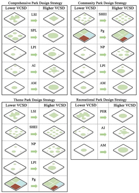Our study demonstrates that the dominant factors influencing vegetation carbon sequestration density (VCSD) differ significantly among urban park types. Consequently, spatial design strategies for enhancing vegetation carbon sequestration must be tailored specifically to each park category (Figure 9).