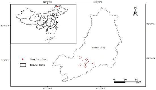 The study was conducted in forested mountains managed by the Genhe Forestry Bureau, located in the Da Xing’anling region of Inner Mongolia, China, at an average elevation of 848 m. This mountain range lies within the cold–temperate humid forest zone and is characterized by a continental monsoon climate. The mean annual temperature is –5.5 °C, with long, harsh winters, short summers, and transitional spring and autumn seasons. The official fire prevention period is divided into two phases: spring (March–May) and autumn (September–November) []. Historically, forest fires peak in May and November, coinciding with the driest periods. To ensure safety while collecting representative fuel data that reflect vegetation growth and accumulation, the survey was conducted between August and September, thereby avoiding peak fire danger months. The dominant vegetation consists of coniferous forests, primarily Larix gmelinii (Ruprecht, 1854), followed by Betula platyphylla (Sukaczev, 1911), Populus tremula (Linnaeus, 1753), and other species. The understory shrub layer includes Ledum palustre (Linnaeus, 1753), Rhododendron (Linnaeus, 1753), and tall Pinus pumila, among others.