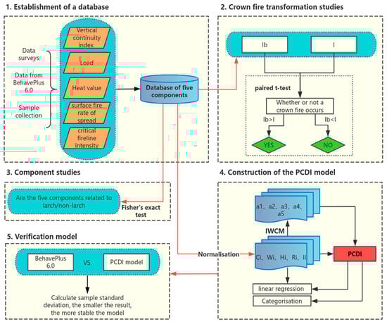 Figure 3 illustrates the overall research process for developing the PCDI. This study systematically integrated multiple critical factors, including fuel vertical continuity, fuel loading, heat value, and fire behavior in both surface and crown fires. These variables were normalized and weighted using the independent weight coefficient method, allowing for the quantitative assessment of crown fire occurrence probability and associated dangers. In addition, rigorous statistical analyses were performed to validate the robustness of the model.
