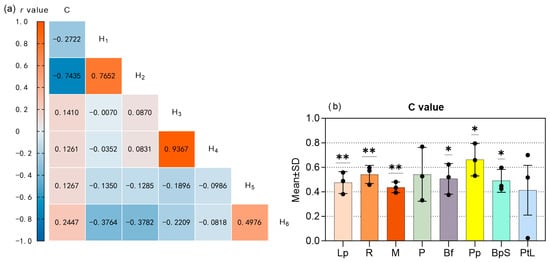 Correlation matrix of the continuity index (C) (a) and the variability of index C in different forest types (b). Absence of * indicates no significant difference; * indicates a significant difference at p < 0.05; ** indicates a significant difference at p < 0.01.