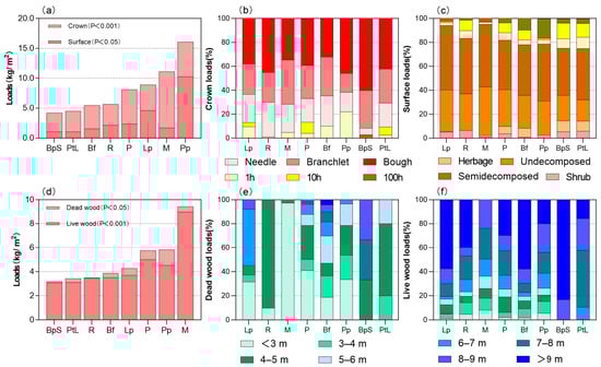 Vertical distribution of fuel loads on the surface and crown (a), percentage distribution of fuel loads on the crown (b), percentage distribution of fuel loads on the surface (c), vertical distribution of dead and live wood in the crown (d), percentage of dead wood at different heights (e), percentage of live wood at different heights (f). In addition, (b,c) use the same color legend, while (e,f) use another one.