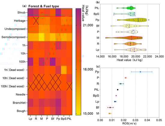 Heat values across fuel types (a), overall heat values of forest types (b), and ROS fluctuations (c). For (b), absence of * indicates no significant difference; * indicates a significant difference at p < 0.05.
