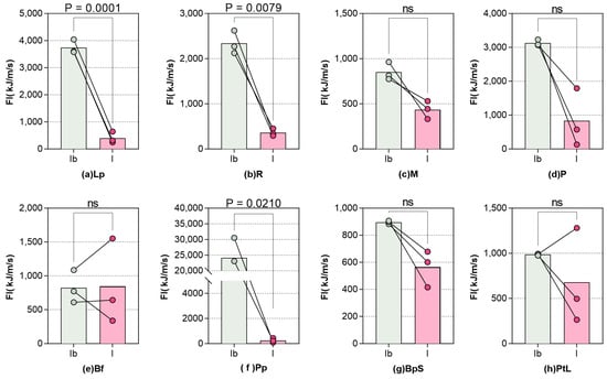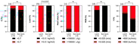 Regarding ROS, Pp exhibited greater variability, with spread rates ranging from 0.02 to 0.05 m/s, categorizing it within the middle-to-high speed class. In contrast, all other forest types maintained spread rates below 0.03 m/s, indicating greater stability and classification within the low-speed category (Figure 6c). This suggests that Pp is more prone to fire variability, whereas the other forest types exhibit more predictable spread rates. Among the eight forest types, Ib consistently exceeded I in all types except Bf and PtL, with statistically significant differences observed in Lp (p = 0.0001), R (p < 0.01), and Pp (p < 0.05). This implies that, while crown fire occurrence remains uncertain in Bf and PtL, all other forest types demonstrate consistent crown fire potential. Histogram comparisons suggest that the probability of crown fire occurrence follows the order: Pp > Lp > R > P > M > BpS > PtL > Bf (Figure 7). Furthermore, Fisher’s exact test showed that, when applying threshold values of 0.7, 5.0 kg/m2, 19,000 kJ/kg, 0.025 m/s, and 800 kJ/m/s to the five components, only fuel loading exhibited a statistically significant difference (p < 0.05) between larch and non-larch forests (Figure 8).