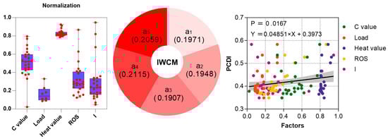 The normalized concentration distributions of the five components were as follows: index C ranged from 0.4 to 0.6 (mean = 0.519), loading varied from 0.1 to 0.2 (mean = 0.141), heat values spanned 0.8 to 0.85 (mean = 0.817), ROS ranged from 0.2 to 0.4 (mean = 0.279), and index I extended from 0.1 to 0.3 (mean = 0.238). Notably, heat values and fuel loading exhibited limited variability, whereas ROS and I displayed wider dispersion, indicating significant inter-sample differences. Pronounced outliers in C, ROS, and I suggested sample-specific anomalies, as depicted in Figure 9. Using the normalized data, the PCDI model was formulated as Formula (11):