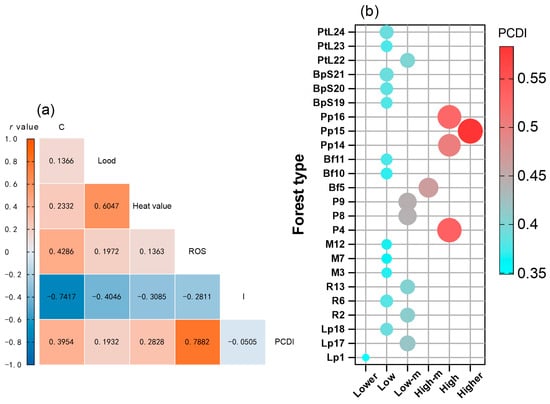 Also, in Figure 9, linear regression analysis indicated that the five components exerted a positive effect on PCDI, with a slope of 0.04851, and the model was found to be statistically significant (p < 0.05). The scatter plot revealed that color-coded data points were distributed within specific intervals along the X-axis—namely, load (0.0 < X < 0.2), ROS (0.2 < X < 0.4), I (0.0 < X < 0.4), C (0.4 < X < 0.6), and heat value (0.8 < X < 1.0)—while exhibiting distinct trends along the Y-axis. Although all factors demonstrated a positive correlation with PCDI, the magnitude of their individual influences varied. The dispersion of data points and the moderate slope of the regression line suggest that, despite statistical significance, the overall effect of these factors on PCDI remains relatively modest. Furthermore, the correlation matrix presented in Figure 10a revealed a significant positive correlation between heat value and fuel load (r = 0.6047), while index C and ROS exhibited a moderate positive correlation (r = 0.4286). In contrast, index I was negatively correlated with all the other factors, with the strongest negative correlations observed between index C (r = −0.7417) and fuel load (r = −0.4046). Additionally, PCDI was significantly positively correlated with ROS (r = 0.7882) and displayed a marked positive correlation with index C (r = 0.3954).