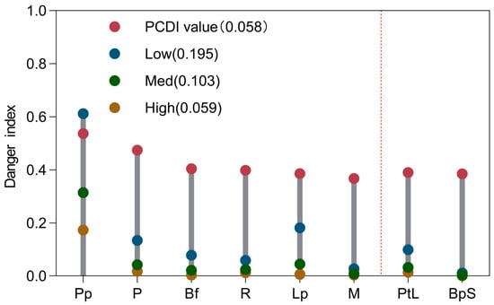 Finally, grouping statistics were calculated (Figure 10b). The analysis revealed that the majority of sample plots (75.00%) exhibited PCDI values within the low to low–middle range, encompassing nearly all forest types. In contrast, a smaller proportion of plots fell into the lower (4.17%), high–middle (4.17%), high (12.50%), and higher (4.17%) PCDI levels, with the affected forest types including Lp, P, Bf, and Pp. Notably, Pp displayed significantly higher PCDI values compared to other forest types, suggesting an elevated danger of crown fire occurrence in this forest type. Overall, based on PCDI rankings, the eight forest types can be arranged in descending order as follows: Pp > P > Bf > R ≈ Lp ≈ BpS ≈ PtL > M.