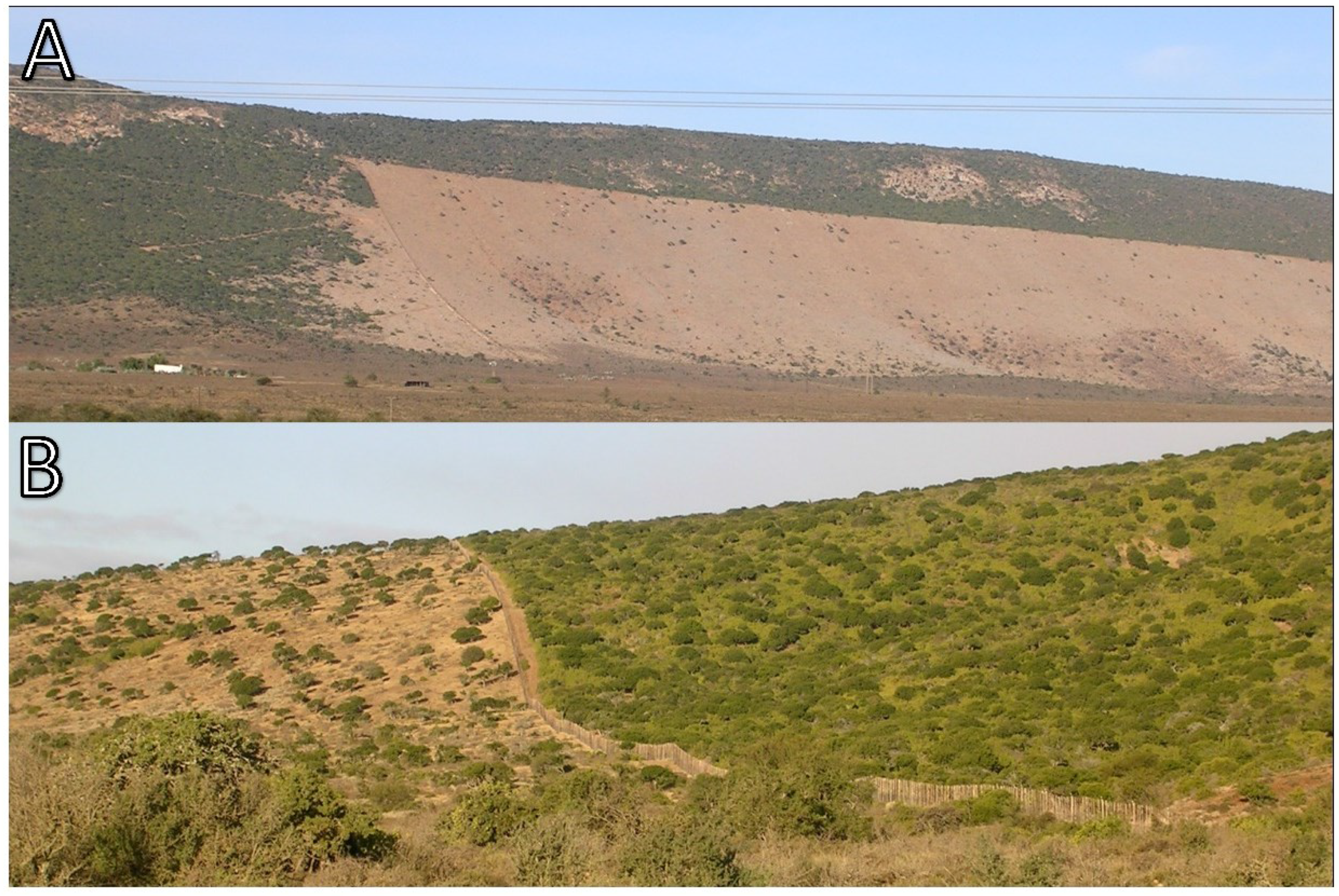 - Van der Vyver, M.L.; Cowling, R.M.; Campbell, E.E.; Difford, M. Active restoration of woody canopy dominants in degraded South African semi-arid thicket is neither ecologically nor economically feasible. Appl. Veg. Sci. 2012, 15, 26–34. [Google Scholar] [CrossRef]
