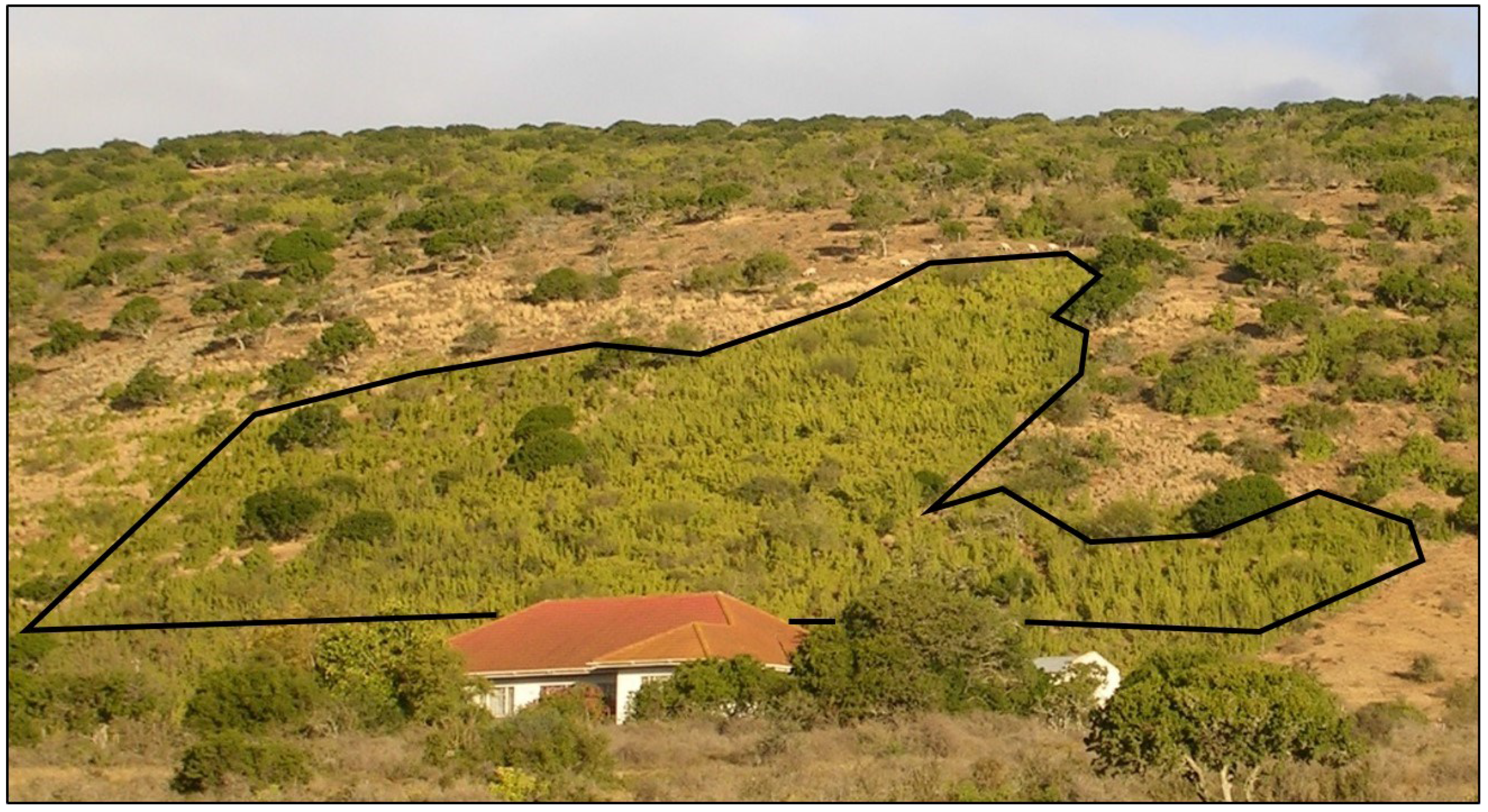 | 4 | Availability of ecological data on fence-line contrasts between degraded and intact thicket [28,29]. |