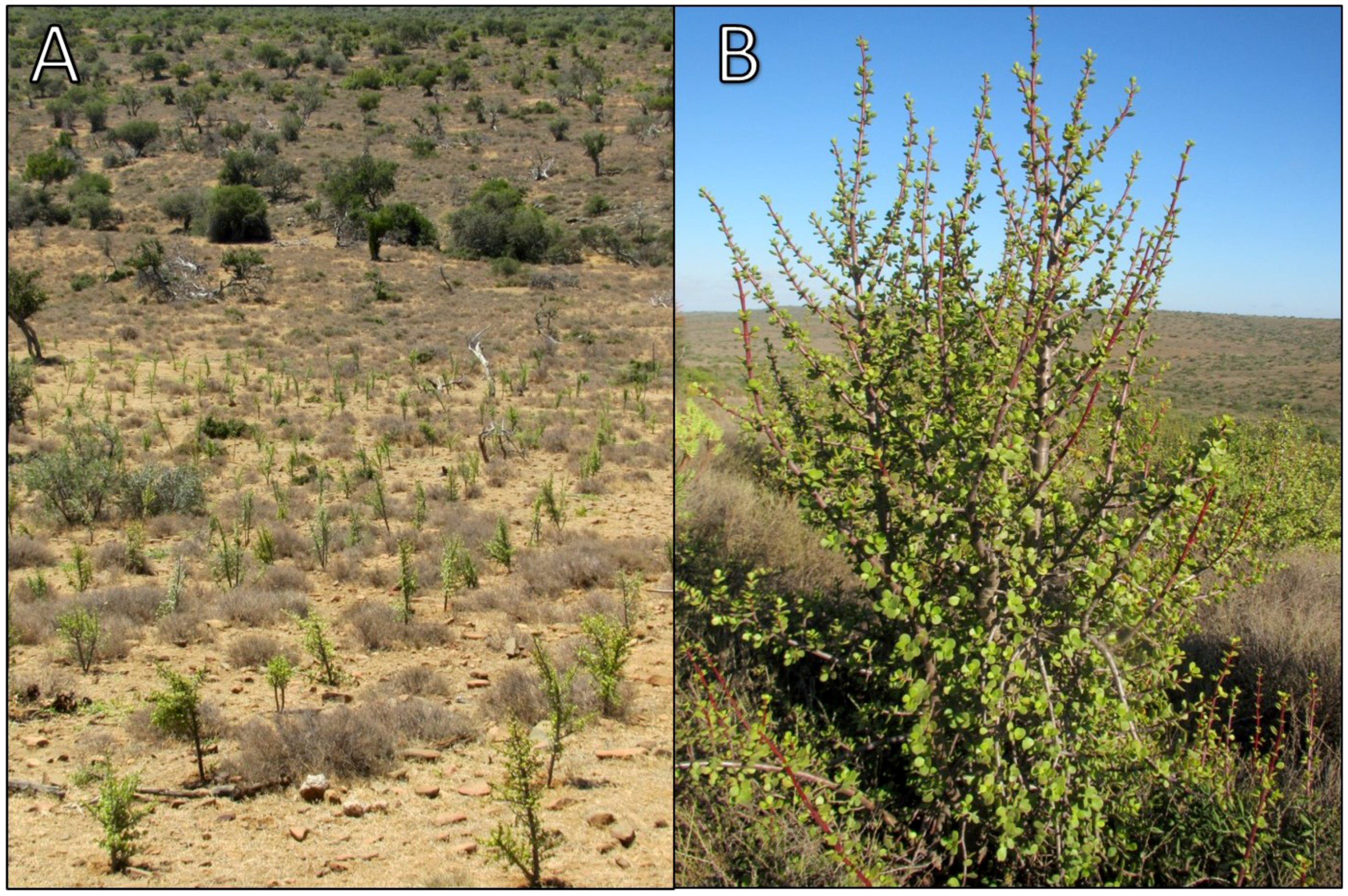 Fence-line contrasts of degraded versus intact subtropical thicket in the Eastern Cape, South Africa. (A) ~45 km NE of Steytlerville; (B) ~80 km SE of Steytlerville.