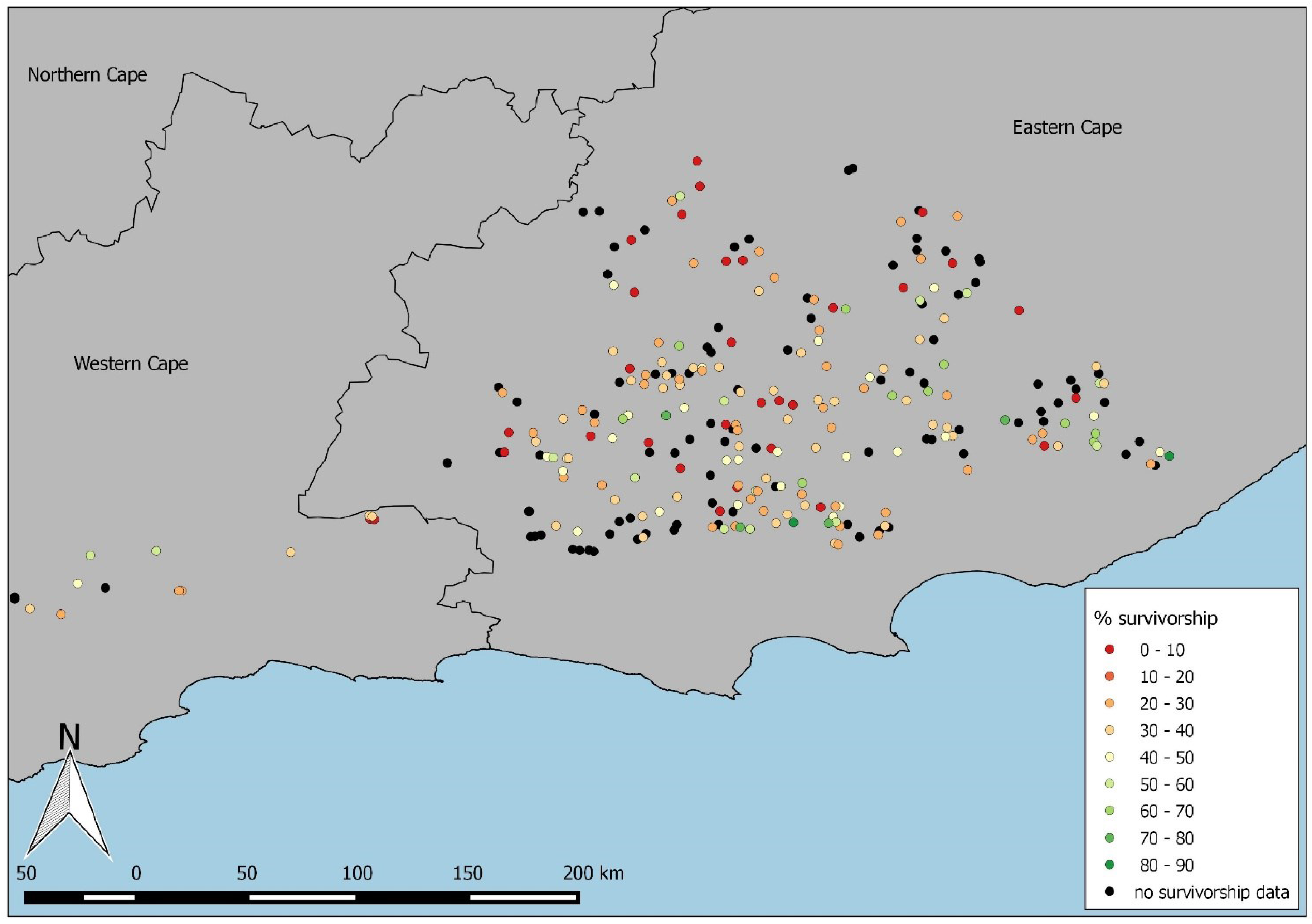 Location of the 331 plots within the large-scale restoration experiment conducted by the STRP in the Eastern Cape and Western Cape, South Africa. Different colours of circles denote average survivorship across all treatments in individual plots.