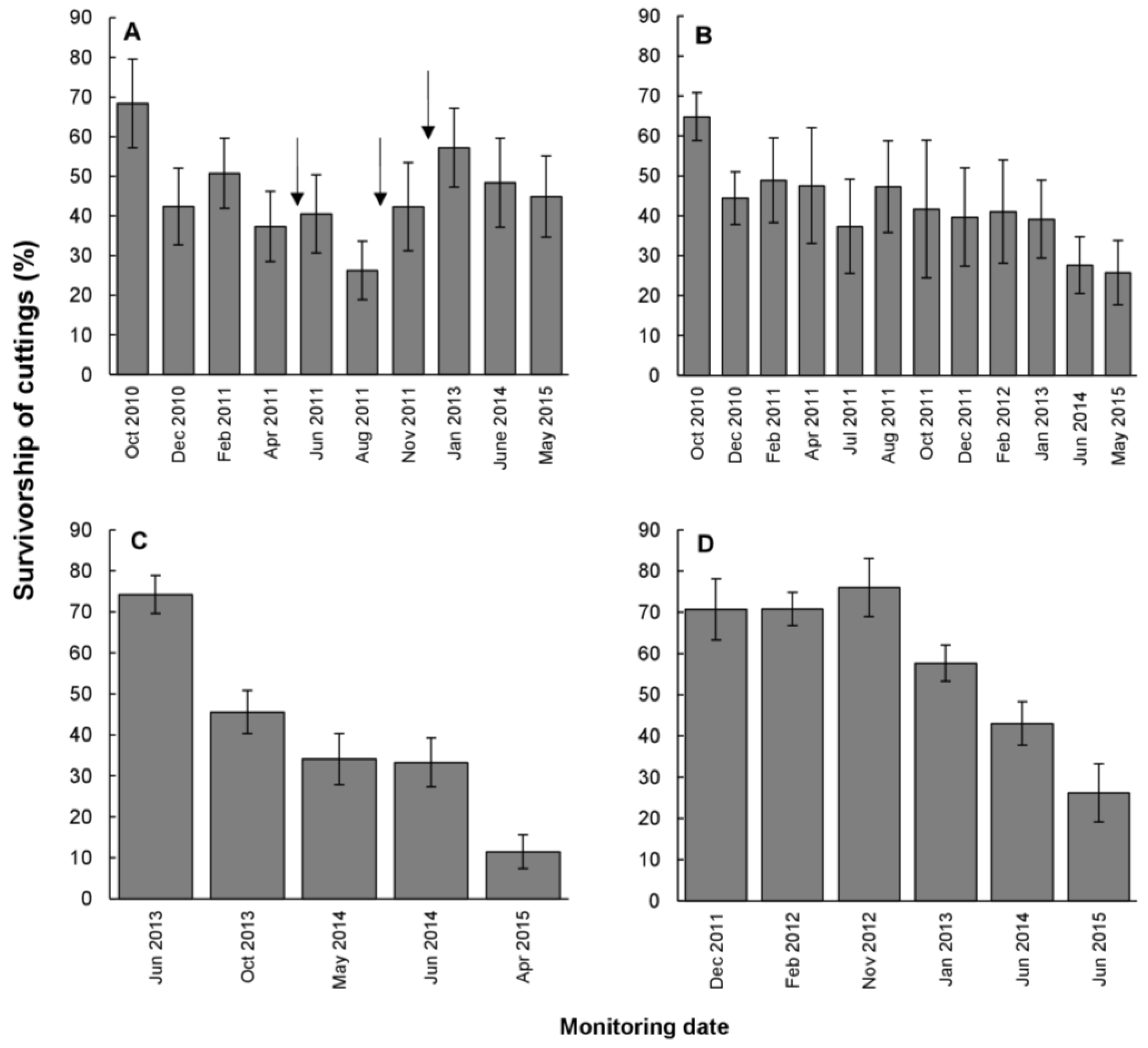 Percentage survivorship (± standard error) of spekboom cuttings (20 mm basal diameter at planting) planted at sites in the Eastern Cape, South Africa. (A) 50 hectare of plantings ~40 km SE of Steytlerville; (B) 50 hectare of plantings ~30 km NW of Jansenville; (C) 110 hectare of plantings ~65 km SE of Graaff-Reinet; (D) 104 hectare of plantings ~70 km W of Riebeek East. All sites were planted at an initial density of 2600 to 5000 cuttings per hectare. Data were recorded in 2015 from 10 m × 10 m plots and the number of plots sampled in each site varied from 5 to 15. Arrows indicate events of supplementary planting.