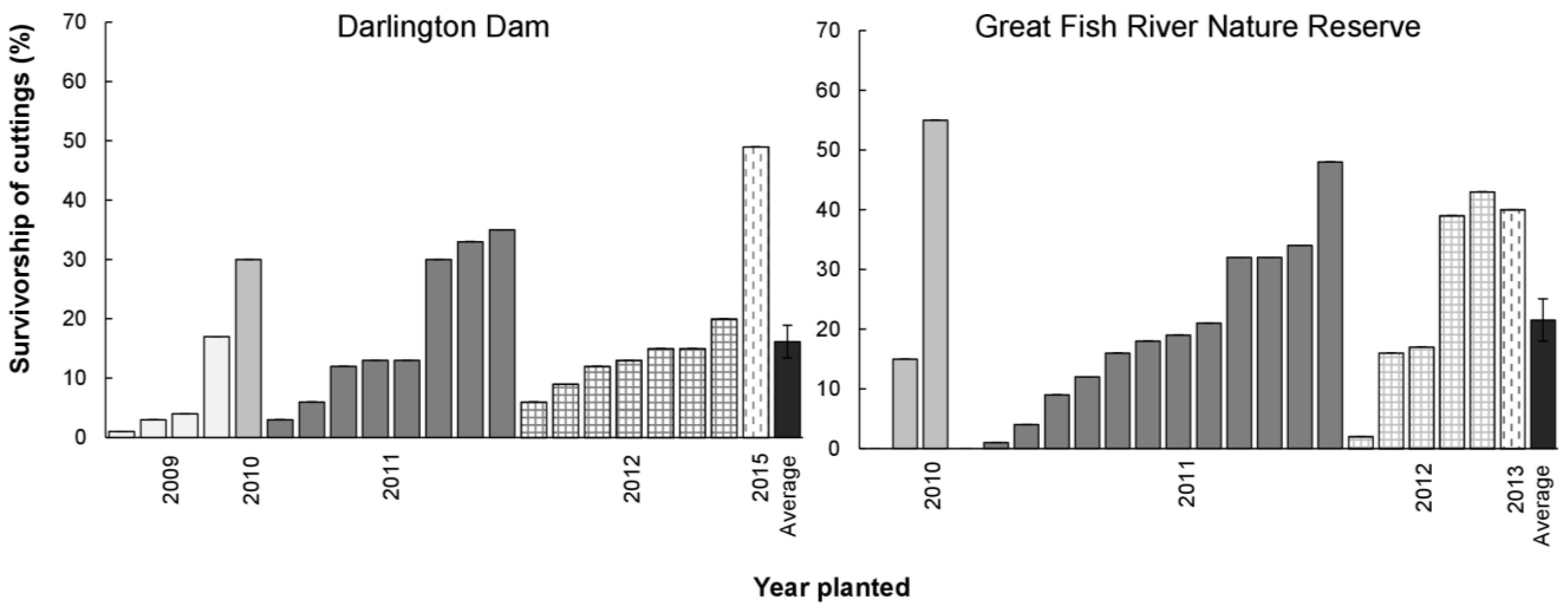 Percentage survivorship of spekboom cuttings planted in different years at sites in the Eastern Cape, South Africa. Darlington Dam (within the Addo Elephant National Park) is ~85 km SE of Jansenville. Great Fish River Nature Reserve is ~85 km NE of Grahamstown. Both sites were planted at a density of 2500 cuttings per hectare. Survivorship data were recorded in 2015 from 21 plots (20 m by 20 m). Average percentage survivorships (+ standard error) in Darlington Dam and Great Fish River Nature Reserve, respectively, are indicated by solid black bars.