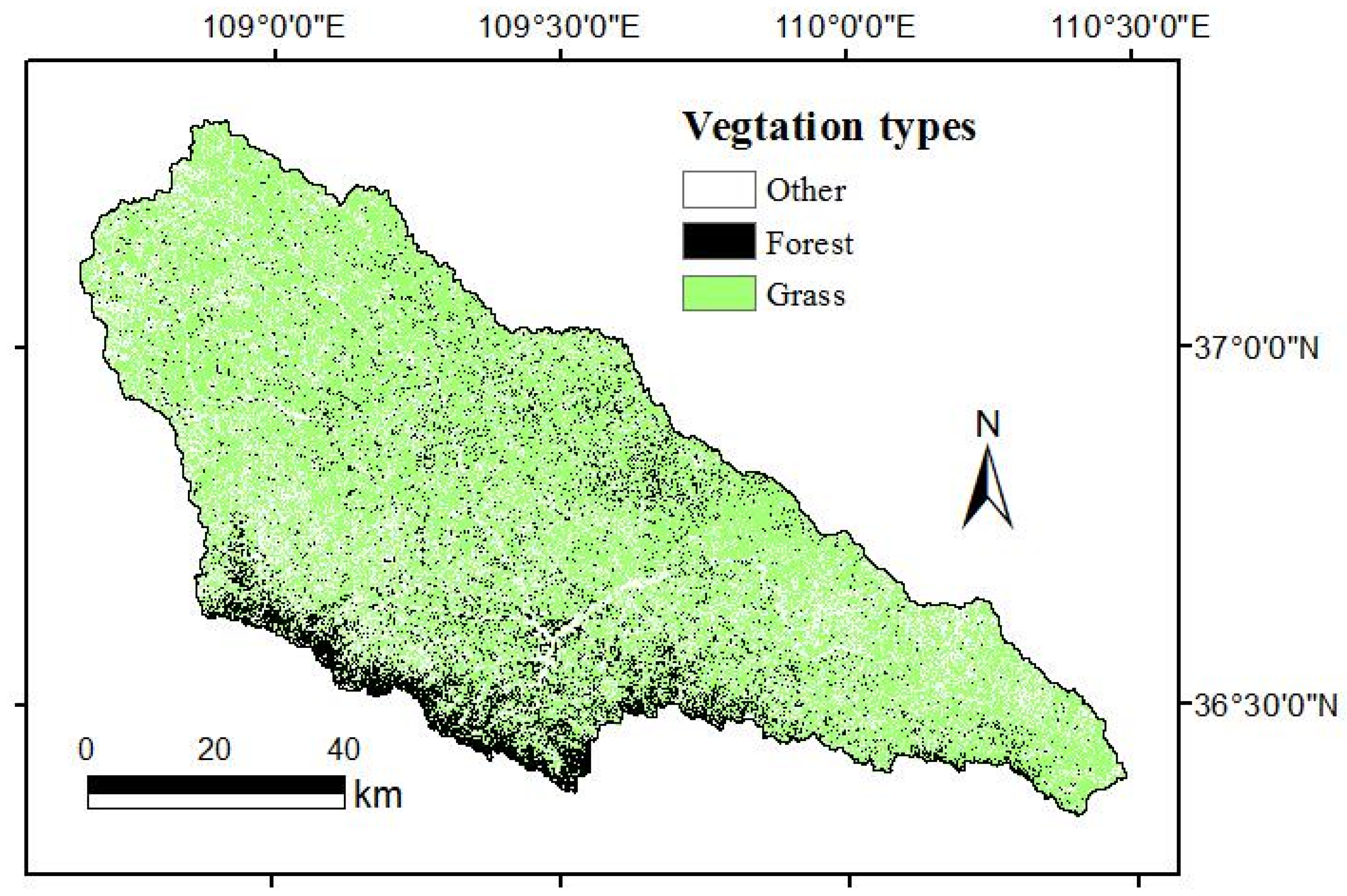 The actual vegetation map we used represented the plant community cover at the time of mapping. It was derived from a land use map provided by the RS/GIS Lab of the Institute of Soil and Water Conservation (ISWC), Chinese Academy of Sciences (CAS). The laboratory has produced a time series of land use maps for monitoring soil erosion in the Yanhe River catchment. These land use maps were extracted using a supervised classification method based on Landsat Thematic Mapper (TM) images and include six different land use types, namely farmland, forest land, grass land, water bodies, constructions and unused land. In this study, the land use map for 2013 was selected to match our field work, which was carried out in 2013. For comparison with PNV, only two vegetation types, forest and grass, were depicted on the map with the remaining four land use classes amalgamated as one type of land use (Figure 2).