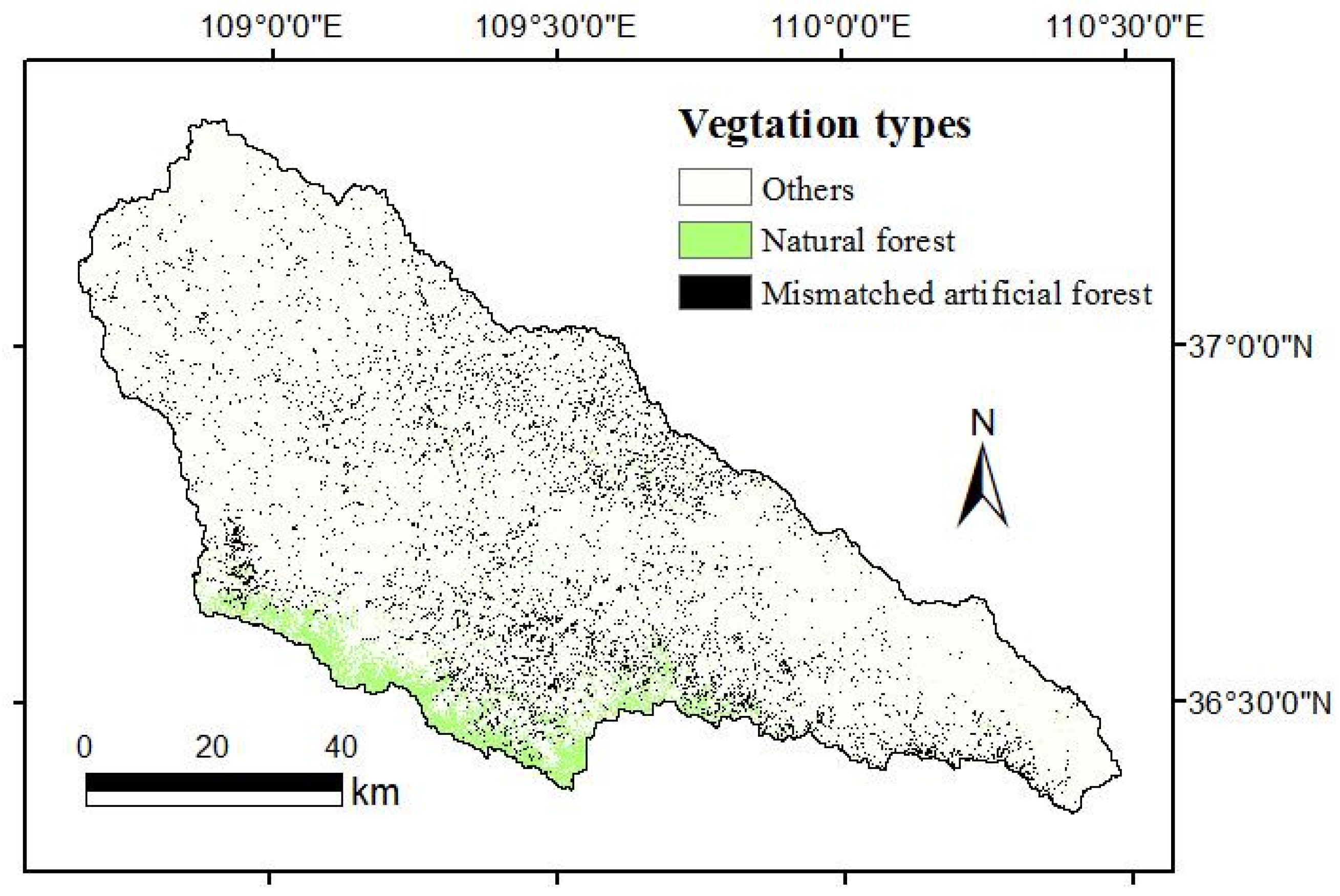 Distribution of mismatched planted forest (the actual forest beyond the boundary of potential natural forest) and natural forest in the Yanhe River catchment.