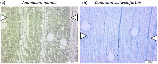 - Fichtler, E.; Worbes, M. Wood anatomical variables in tropical trees and their relation to site conditions and individual tree morphology. IAWA J. 2012, 33, 119–140. [Google Scholar] [CrossRef]