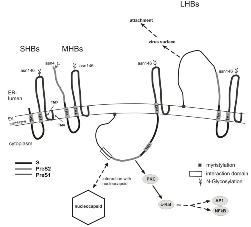 Schematic structure of the HBV surface proteins. The S-domain is common to all three HBV surface proteins. In the case of the large surface protein (LHBs), TM1 is not used as a start transfer signal, resulting in a cytoplasmic orientation of the PreS1PreS2 region. In a fraction of LHBs the PreSPreS2 domain is posttranslationally translocated across the ER membrane. In this case, the PreS1PreS2 domain faces the lumen of the ER. The two forms of LHBs fulfill different functions. This fraction that faces the ER lumen is exposed to the viral surface in the mature viral particle and is involved in the attachment process. The cytoplasmic form mediates the contact to the nucleocapsid and triggers intracellular signal transduction cascades by the interaction of the PreS2 domain with protein kinase C (PKC).