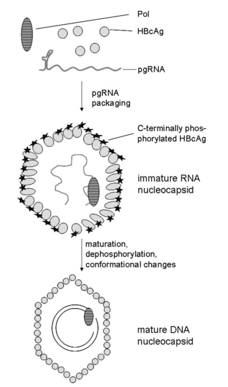 Genome packaging and nucleocapsid maturation. HBV nucleocapsid formation starts when the complex of the RNA pregenome , HBV polymerase and HBcAg dimers has formed. Efficient packaging of the RNA pregenome requires phosphorylation in the C-terminal part of the core protein. Conversion of the immature RNA-containing nucleocapsid to the mature DNA-containing nucleocapsid is associated with dephosphorylation and conformational changes. These significant differences in the structure between the RNA-containing immature nucleocapsid and the mature nucleocapsid trigger the envelopment of the mature nucleocapsid.