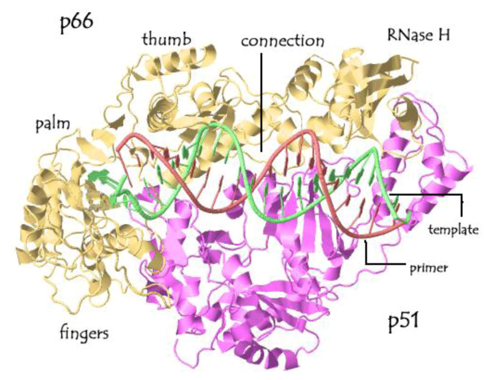 The p66 subunit of RT can be divided structurally into the polymerase and RNase H domains. The polymerase domain can be further differentiated into subdomains that have been described as structurally resembling a right hand, forming the fingers, palm, thumb, and connection subdomains [1,3-6]. In the heterodimer, p66 has an “open” conformation, which facilitates binding to the incoming RNA template/tRNA complex during reverse transcription [1,4,7].