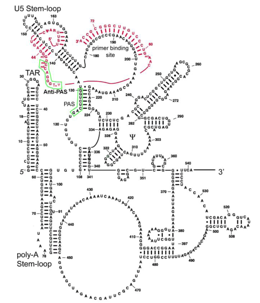 Model of the HIV-1 RNA structure from +1 to +540. Proposed interactions between tRNALys,3 and the U5 Stem-loop are indicated. The viral RNA sequence is colored black and the tRNALys,3 sequence is in red. TAR: transactivation response element. Poly-A Stem loop contains the poly-adenylation signal AAUAAA functions on the 3’ long terminal repeat. The ψ indicates the vRNA packaging signal. The PAS on the vRNA and the anti-PAS on tRNALys,3 are boxed in green. Adapted from Wilkinson et al. (2008) [24].