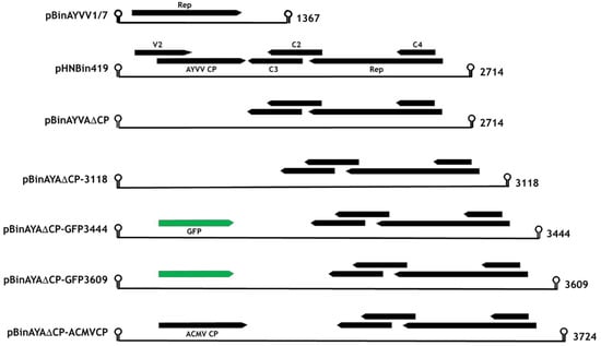 Linear representation of the replicating gene constructs with the known or predicted circular length, in nucleotides, for each displayed on the right. CP, coat protein; Rep, viral protein involved in rolling circle replication; C2, C3, C4, and V2, viral genes. GFP, green fluorescent protein.