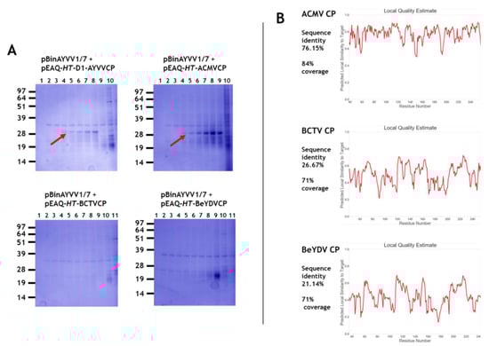 (A) An amount of 12% MOPS buffered NuPAGE gels of caesium sulphate gradient fractions. The infiltrated gene constructions for each gradient are indicated above each gel. Fractions are shown from the bottom (1) to the top of the gradient (10 or 11) from left to right. Red arrows indicate the position of coat protein. (B) Local quality estimation assessments for the 3-D relatedness of the different coat proteins to the known ageratum yellow vein virus (AYVV) coat protein 3-D structure. Relative sequence identity and structural coverage for each are indicated on the left.