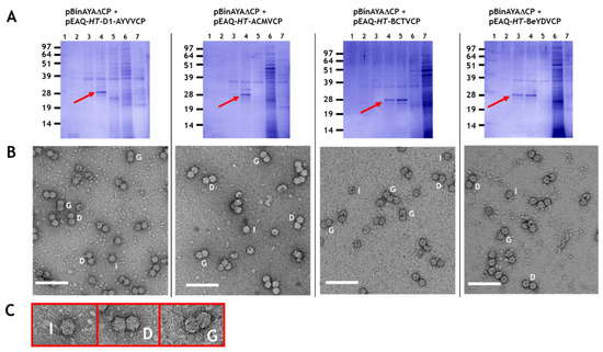 (A) An amount of 12% (w/v) MOPS-buffered NuPAGE gel resolution of caesium sulphate gradient separated virus particles. The infiltrated gene constructs for each are indicated above. Red arrows, caesium sulphate fractions that contain coat protein. (B) Transmission electron microscopy of caesium sulphate fractions that contain coat protein. I, isometric; D, double and G, geminate morphological virus particles. Bar = 100 nm. (C) Expanded images of I, D and G virus-like particles.