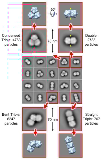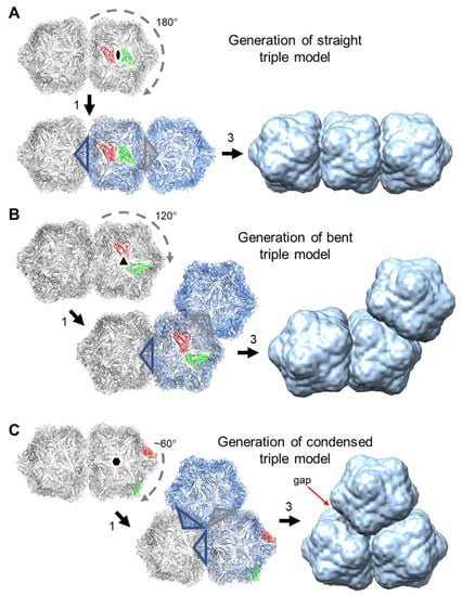 Hypothetical 3-D models of the three morphologies of geminate triples were generated from the previously determined 3.3-Å resolution ageratum yellow vein geminivirus structure (PDB accession code 6F2S; []). In each case, the model was created from two copies (distinguished by grey and blue colouration, respectively) of the geminate double structure by superposition based on symmetry-related subunits. Specifically: 1. the red subunit of one copy was aligned with the green subunit of the other copy using UCSF Chimera [], 2. the two models were merged and one copy of every overlapped pair of subunits was removed as well as all the subunits from the five-fold vertices that were projecting into adjoining partial capsids (the latter are indicated by the colour-coded open triangles; step not explicitly shown in Figure), 3. the resultant models were subsequently rendered as molecular surfaces (not 3-D volumes) at 15 Å resolution to resemble low resolution electron microscope (EM) reconstructions. (A), For the straight triple model, the superposition of two-fold related subunits resulted in a 180° rotation of the second copy. (B), For the bent triple model, the superposition of three-fold related subunits resulted in a 120° rotation of the second copy. (C), For the condensed triple model, the superposition of approximately six-fold related subunits resulted in a ~60° rotation of the second copy. This gave a roughly three-fold symmetric molecular surface with a small gap between two of the partial capsids. By contrast, the corresponding 2-D class average appears to be exactly three-fold symmetric (see Figure 7).